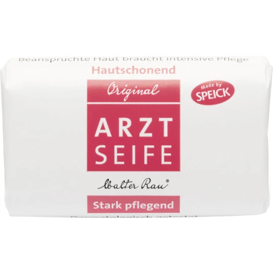 Besonders für häufige Anwendungen empfohlene, sehr stark rückfettende Hautpflege- Seife. Ohne Bakteriostatica.